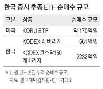 개인투자자들은 미국 시장의 KORU ETF와 유사하게 국내에 상장된 ETF 가운데 MSCI 한국 지수를 추종하는 상품을 순매수했다.