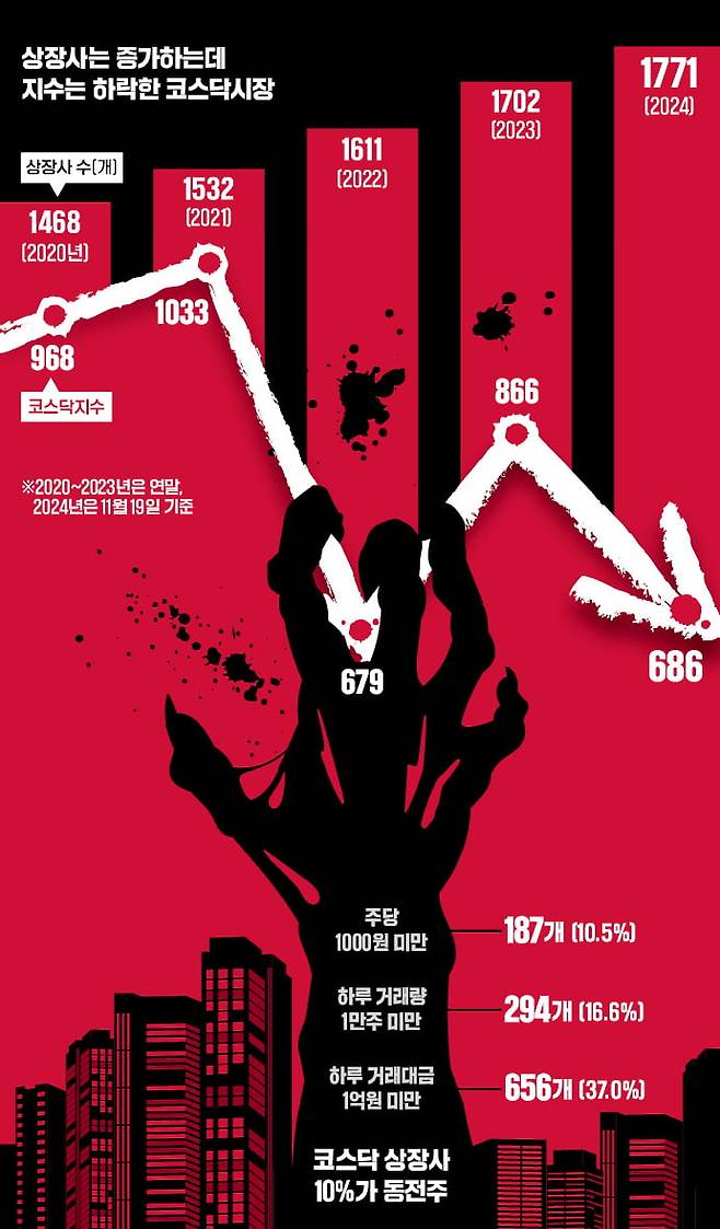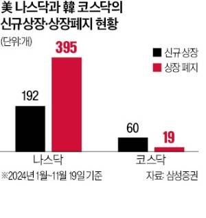 올해 미국 증시가 연일 사상 최고치를 경신하며 축제를 벌이는 동안 한쪽에선 칼바람이 몰아쳤다. 나스닥시장에 약 200개 기업이 새로 입성했지만 그 두 배인 400곳 가까운 기업이 내쫓긴 것이다. 증시가 1년 내내 침체한 한국은 정반대였다. 코스닥시장은 올해 신규 상장 기업이 상장폐지된 기업의 3배에 달했다. 나스닥시장이 문제 기업을 과감히 쳐내는 반면 코스닥시장은 주주 눈치를 보느라 퇴출을 늦추면서 좀비 상태의 기업을 양산하고 있다.