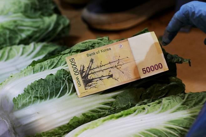지난 18일 서울 서대문구 인왕시장 내 배추 위에 손님이 놓은 5만원권이 놓였다. 5만원이면 배추 10포기만 살 수 있는 돈이다. 소금을 못 샀으니 아직 절이지도 못한다.