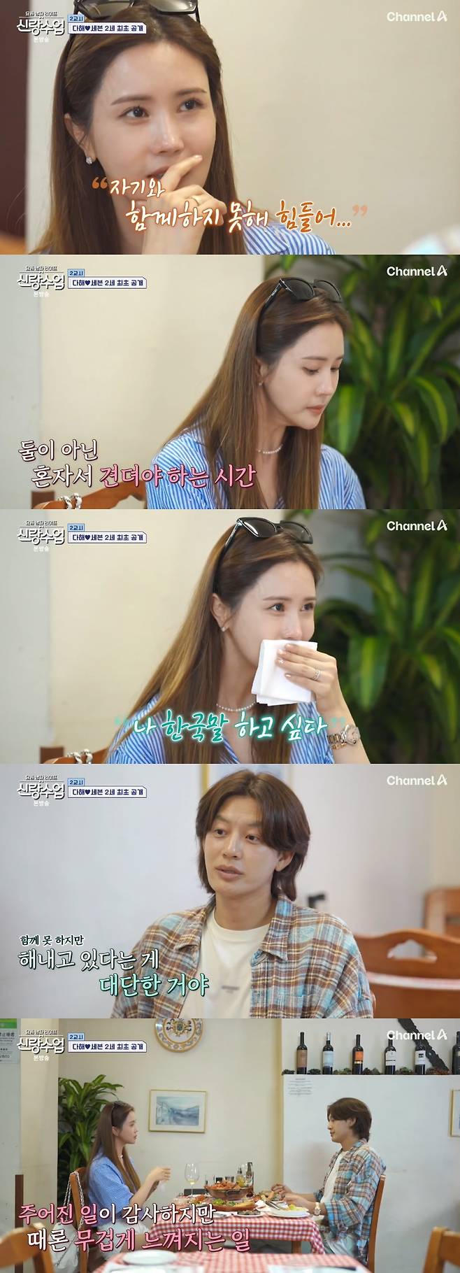 그는 "아무도 없고 혼자 한국인이다. 대우도 너무 잘해준다. 근데 가끔은 한국말 하고 싶다는 생각이 든다. 우리 아직 신혼인데 같이 하지 못해서 힘들 때도 있다"며 외로운 마음을 고백했고, 세븐은 "힘들지 않다. 자기가 지금 그걸 해내고 있다는 게 대단하다"고 했다.