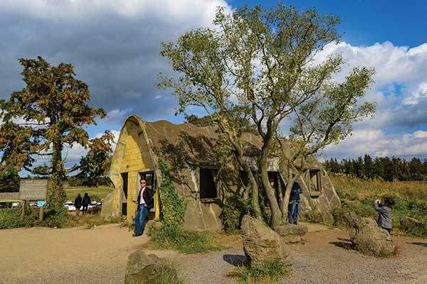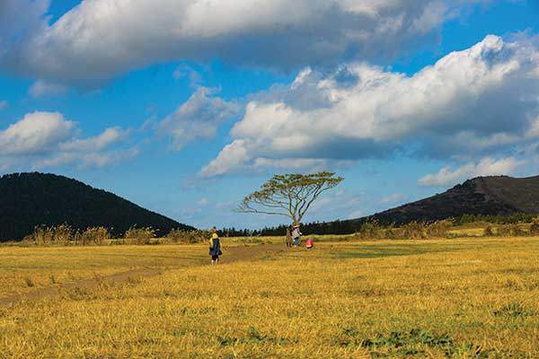가메오름은 전체적인 모양이 참 신비롭다. 하늘에서 내려다보면 꼬리지느러미까지 갖춘 게 초록 바다를 헤엄치는 한 마리의 물고기를 떠올리게 한다. 길 건너편의 누운오름이 가메오름을 향해 'U'자로 열린 모양이어서 집으로 들어가는 듯 보여 더 그렇다.