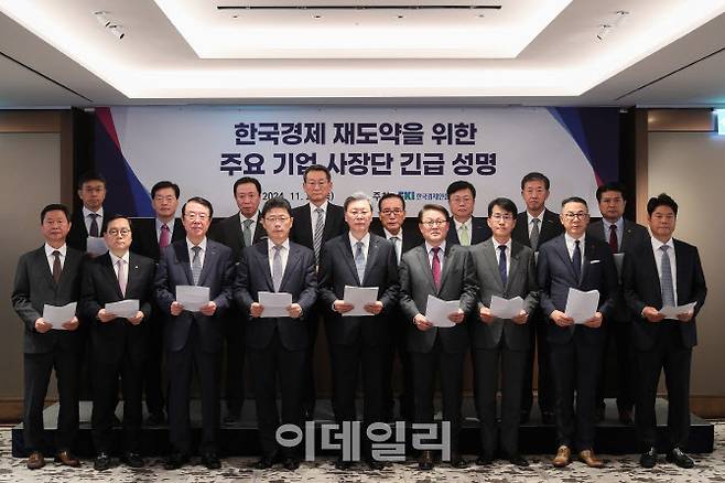 주요 기업 사장단은 21일 오전 서울 중구 롯데호텔에서 이 같은 내용의 ‘한국경제 재도약을 위한 주요 기업 사장단 긴급 성명’을 발표했다. 이들은 경제 심리 회복을 위한 국회, 정부, 국민의 지지와 지원을 호소했다.