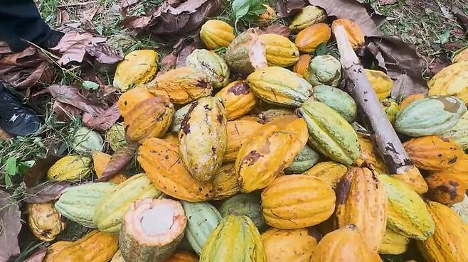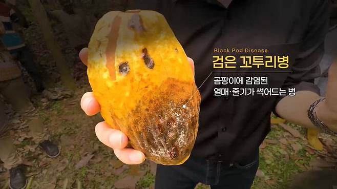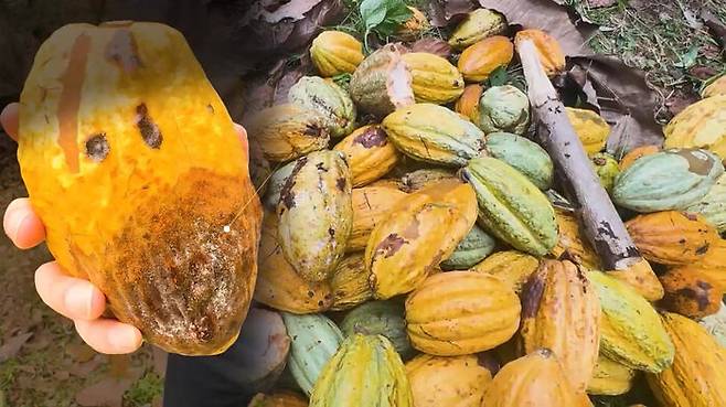 그런데 지난해부터 이 지역에 식물 전염병이 기승을 부리기 시작했습니다. 병명은 '검은 꼬투리병(Black Pod Disease), 코코아 열매에 치명적인 검은 곰팡이가 피는 질병입니다. 감염되면 줄기와 열매가 빠르게 썩어들어가는데, 치료법이 없어 나무째 베어내는 수밖에 없습니다.