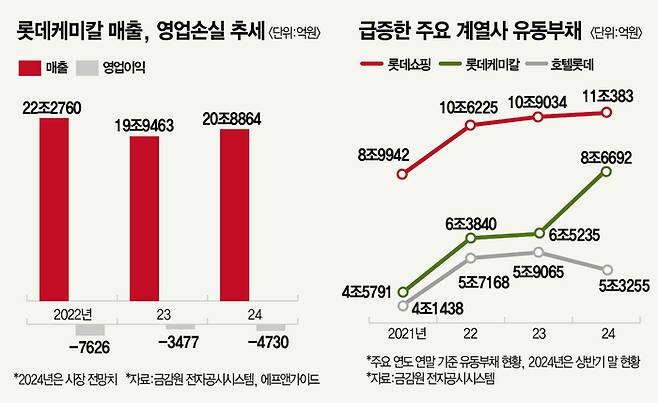 시장 변화 적기 대응에 실패했다는 점이 패착으로 지목된다. 롯데케미칼은 경쟁사 대비 기초석유화학 비중이 더 높다. 지난해 연결 기준 전체 매출의 60%에 달한다. 이미 수년 전부터 중국발 공급 과잉 우려로 고부가 스페셜티 제품으로 전환에 속도를 내야 한다는 시각이 확산했지만, 결과적으로는 실기(失期)했다. 롯데케미칼은 2022년 7626억원 영업 적자를 냈고 2023년 3477억원의 손실을 봤다. 올해 실적 전망도 어둡다. 시장에서 전망하는 2024년 롯데케미칼 영업손실 규모는 4730억원에 달한다.