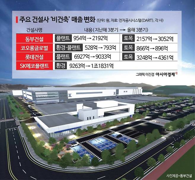 신사업을 확대한 것이 실적을 늘리는 데 큰 영향을 미쳤다. 동부건설은 2021년 플랜트 산업을 신사업으로 육성하겠다고 점찍었다. 이어 올해 초 ‘팀’ 단위였던 산업플랜트팀을 ‘플랜트사업부’로 승격하며 힘을 실었다. 올해 플랜트 발주 확대에 따라 수주 물량도 늘고 실적도 확보하게 됐다. 주택 사업 매출이 줄어든 것과는 상반된 흐름이다. 동부건설의 올해 3분기 건축 공사(주택 포함) 실적은 5657억원으로 1년 전(9423억원)보다 40% 감소했다. 전체 매출액 가운데서 차지하는 비중도 같은 기간 67%에서 44%로 쪼그라들었다.