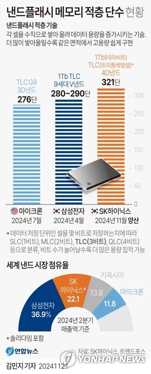 (서울=연합뉴스) 김민지 기자 = 고대역폭 메모리(HBM) 시장에서 격전 중인 '메모리 3사'가 인공지능(AI) 시대 도래로 급부상한 낸드 플래시에서도 치열한 경쟁을 펼치고 있다.