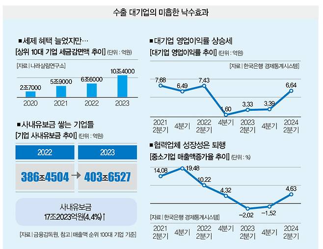 기업들은 먼저 이익유보금을 늘렸다. 홍성국 더불어민주당 의원이 국회예산정책처에서 받은 자료에 따르면 매출액 대비 사내유보금 비율인 유보율은 100대 기업이 2012년 46.7%에서 2021년 62.0%로 상승했고, 10대 기업은 같은 기간 53.4%에서 80.1%로 치솟았다. 사내유보금은 기업이 이익 중에서 주주에게 배당하지 않고 남은 돈으로 현찰, 부동산, 생산설비 등 형태로 존재한다.