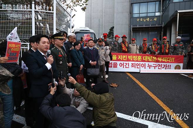 | ▲ 결심공판을 마친 뒤 군사법원앞에서 박정훈 대령과 변호인단이 참석한 가운데 기자회견이 열리고 있다. 군인권센터 임태훈 소장이 발언하고 있다. |