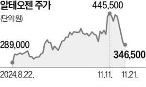 장중엔 알테오젠이 2000억원 규모 RCPS 발행을 추진하고 있다는 소식도 더해졌다. 이와 관련해 회사 측은 “확정된 바 없다”고 했다. 박희찬 미래에셋증권 리서치센터장은 “주가가 높아진 상태여서 작은 악재에도 차익 실현 기조를 자극할 수 있었다”고 말했다. 올 들어 이달 11일까지 알테오젠 주가 상승률은 352.28%에 달한다.