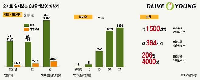 올리브영은 달랐다. 팬데믹 기간 동안 매장 수를 오히려 늘려나가며 온라인과 오프라인 채널을 함께 키우는 ‘옴니채널’ 전략을 택했다. 다른 매장이 철수한 상권에 올리브영 간판을 걸어 달며 외형 확장을 꾀했다. 2021년 1260개였던 전국 올리브영 매장은 올해 9월 기준 1369개까지 늘었다.