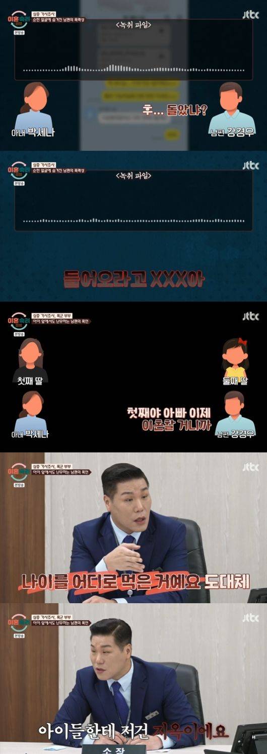 서장훈은 "아이들은 다른방에 있냐"고 물었고, 아내는 "같이 있었다. 폭군이다. 본인 기준에 맞지 않으면 발끈해서 밀어붙이는 성격이다"라고 말했다. 또다른 녹취에서 남편은 큰딸에게 "아빠 이혼할거니까 누구랑 살거냐. 네엄마랑 못살것같다"고 직접적으로 언급했고, 결국 딸은 울먹여 안타까움을 자아냈다.