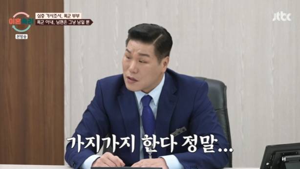 이에 서장훈은 "이유가 있겠죠? 이유가 있어서 저래도 된다고 생각하는건 미친생각이다. 저정도로 욕을 하고 폭력적인 행동할거면 더이상 얘기할것도 없다. 그냥 안살면 된다. 이꼴을 당하면서 어떻게 사냐. 나중에 분노조절 장애가 어떻게 올라올지 모르지 않냐"며 "밖에서도 저러녀. 밖에서는 안그런데 아내한테 왜 그러냐. 밖에서 딴사람한텐 아무소리 안하고 아내한테만 욕을 한다? 얼마나 비겁하냐"고 꼬집었다.