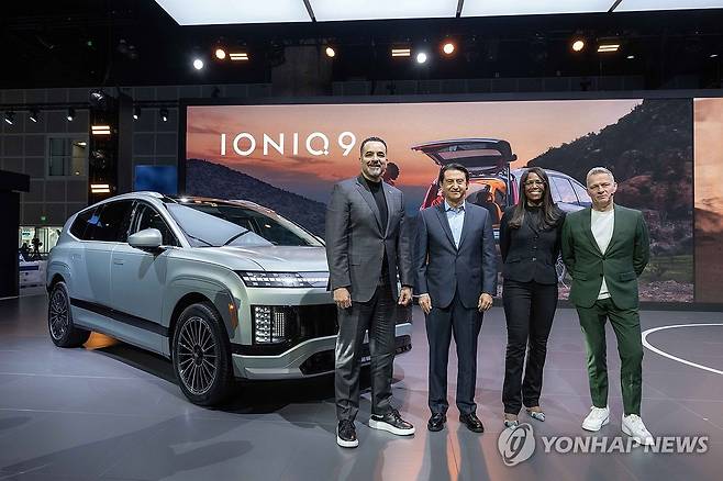 (서울=연합뉴스) 현대자동차는 21일(현지시간) 미국 LA 컨벤션 센터에서 열린 '2024 LA 오토쇼(2024 Los Angeles Auto Show)'에서 '아이오닉 9(IONIQ 9)'을 공개하고 '이니시움(INITIUM)'을 북미 시장에 최초로 선보였다고 22일 밝혔다. 사진은 왼쪽부터 현대차 미국판매법인(HMA) 랜디 파커(Randy Parker) CEO, 현대차 글로벌 최고운영책임자(COO) 호세 무뇨스(Jose Munoz) 사장, 현대차 북미권역 제품기획 및 모빌리티전략 담당 올라비시 보일(Olabisi Boyle) 전무, 현대디자인센터장 사이먼 로스비(Simon Loasby) 전무가 아이오닉 앞에서 기념 촬영하는 모습. 2024.11.22 [현대자동차 제공. 재판매 및 DB 금지]
