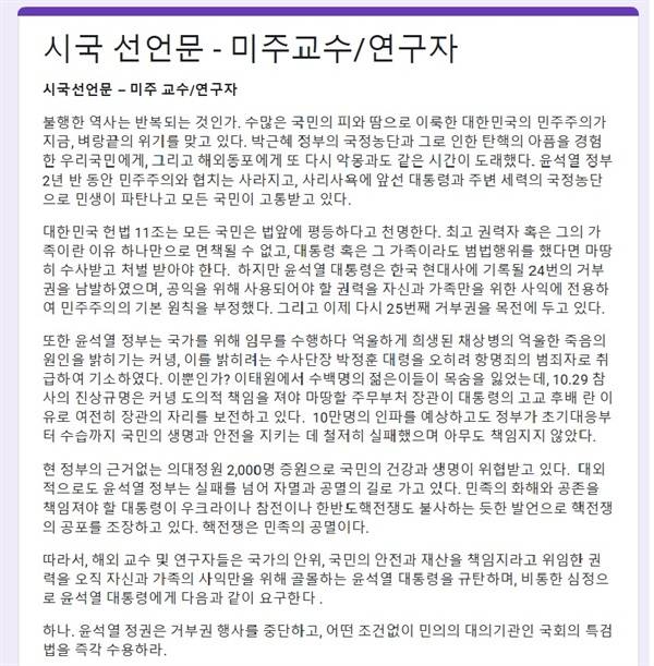 시국선언문 - 미주 교수/연구자