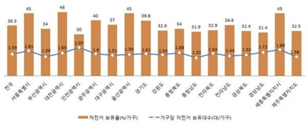 | ▲ 국내 자전거 보유율 및 보유 대수 (2016년 기준) 한국교통연구원이 조사한 국내 자전거 보유율 및 보유 대수 |