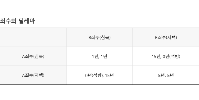 서로 격리된 두 죄수가 형량을 최소화하기 위해 머리를 쓸 경우, 가장 이익이 되는 선택을 하지 못하는 상황을 보여준 것이다.
