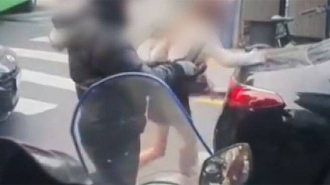 여성은 옆에 있던 오토바이 운전자에게 욕설을 내뱉더니 휴대폰을 쥔 손으로 자신의 차를 쿵쿵 내리칩니다.