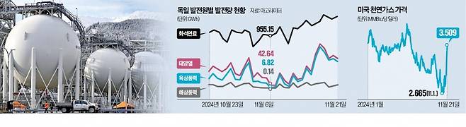독일에서는 이달 중순 이후 신재생에너지 발전량이 다시 안정화됐다. 하지만 녹색 정전 사태와 이에 따른 가스 발전 확대는 영국과 북유럽 국가에서 동시다발적으로 발생해 가스 가격을 급격히 끌어올렸다. 이달 초 영국에서는 풍력 발전이 오전과 저녁 최대 전력 수요 시간대에 전력 수요의 3~4%만 충족했고, 이에 따라 가스 발전소가 가동돼 약 60%의 전력 수요를 충당했다. 나머지 전력은 원자력, 장작 등 바이오매스와 전력망 연결을 통한 수입 전력 등이 채웠다.