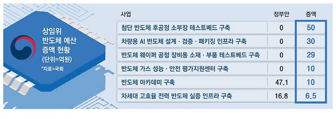 정부 대책에는 이미 국회 산업통상자원중소벤처기업위원회에서 증액을 의결한 내년 반도체 예산이 대거 포함될 전망이다. 산자위는 예비심사 과정에서 정부안에 없던 첨단 반도체 후공정 소부장 테스트베드 구축 예산 50억원과 차량용 AI 반도체 설계·검증·패키징 인프라스트럭처 조성 예산 30억원 등을 반영해 예산결산특별위원회로 넘겼다.