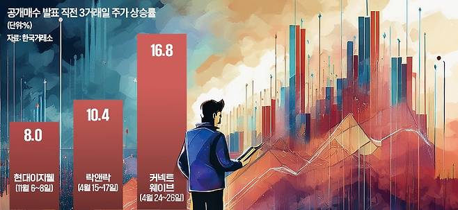 현대지에프홀딩스가 지난 11일 현대이지웰 공개매수를 발표하기 전에도 주가가 갑자기 뛰었다. 공개매수 발표 전 3거래일간 주가 상승률은 8.0%를 기록했다. MBK파트너스가 공개매수 후 자진 상장폐지한 커넥트웨이브는 4월 공개매수 발표 직전 5거래일간 주가가 24.8% 급등했다. 직전 거래일에만 주가가 18.9% 올랐다.