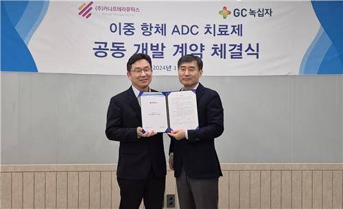 ■GC녹십자는 카나프테라퓨틱스와 이중항체 약물접합체(ADC) 공동개발을 위한 계약을 21일 체결했다고 밝혔다. 이번 계약은 옵션 권리가 포함된 공동개발 계약으로, 카나프가 개발 중인 이중항체 ADC 후보물질이 양사가 합의한 요건에 충족할 시 GC녹십자가 옵션 행사를 통해 공동 개발에 참여하는 형태다. 양사는 타겟·옵션 요건, 전체 계약 규모 등의 구체적인 계약 내용은 밝히지 않았다. 양사가 계약을 체결한 이중항체 ADC는 다양한 고형암에 발현하는 타겟을 대상으로 하는 개발 물질로 폭 넓은 환자군 치료가 가능하며, 기존 치료제에 약물 내성을 획득한 환자를 위한 치료제로 개발 가능해 시장성이 크다.