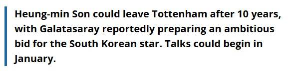 이는 19일 튀르키예 매체 '파나틱' 의견에 힘을 싣는 주장이다. 당시 매체는 "갈라타사라이가 내년 1월 하킴 지예흐를 매각할 계획"이라며 "잠재적 대체자로 손흥민을 눈여겨보고 있다"고 밝혔다.