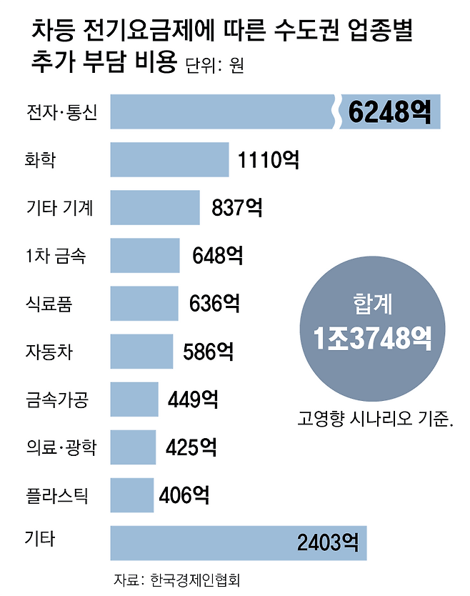 최근 한전이 두 차례에 걸쳐 가정용 전기요금 대신 산업용 전기요금만 올린 가운데 산업계에서도 우려가 나온다. 9월 한국경제인협회는 지역별 차등 요금제가 수도권 제조업에 최대 1조4000억 원의 전력비용 상승을 불러올 수 있다는 분석을 내놨다. 수도권과 비수도권의 도매가격 격차가 kWh당 34원으로 설정되고 이 차이가 모두 소매가격에 반영될 경우(고영향 시나리오)를 가정한 분석이다.