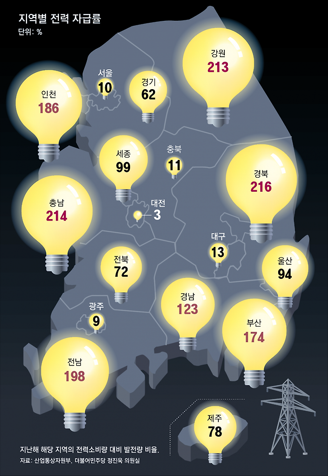전력자급률은 전국적으로 보면 편차가 더 크다. 경북(216%), 충남(214%), 강원(213%), 부산(174%) 등은 소비하는 전력의 2배 안팎까지 전기를 생산해 높은 자급률을 보인다. 반면에 대전(3%), 광주(9%), 충북(11%), 대구(13%) 등은 발전량이 소비량보다 크게 부족해 대부분의 전기를 다른 시도에서 끌어오는 형편이다. 전국 시도에서 전력자급률이 가장 낮은 대전과 가장 높은 경북을 비교하면 그 차이가 72배에 이른다.