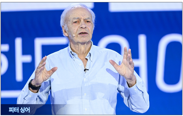 인류의 지속 가능성을 담보하는 필수조건, 기후변화와 환경에 대한 논의도 펼쳐졌습니다. 고등학교 윤리 교과서에도 등장하는, 언론인들이 꼽는 '세계에서 가장 영향력 있는 현존하는 철학자' 피터 싱어 프린스턴대 명예교수가 이 분야 대표 연사로 관객들을 만났습니다. 피터 싱어 교수는 '윤리적 시야 확장의 필요성'을 주제로 "우리의 지구는 더 이상 대체할 곳이 없기에 우리가 가진 모든 가치를 지키기 위해 윤리적 기준을 확장해야 한다"라고 강조했습니다. 그는 윤리적 원칙이 사람뿐 아니라 모든 감각을 가진 생명체로까지 확장돼야 한다면서, 현대 축산 산업이 동물에게 끼치는 고통을 지적해 눈길을 끌었습니다.