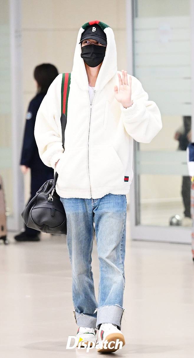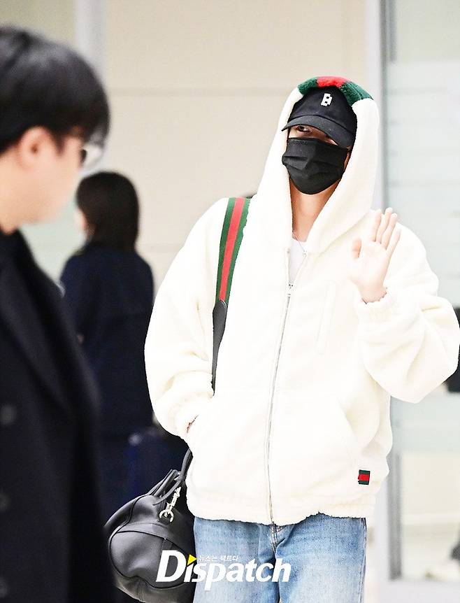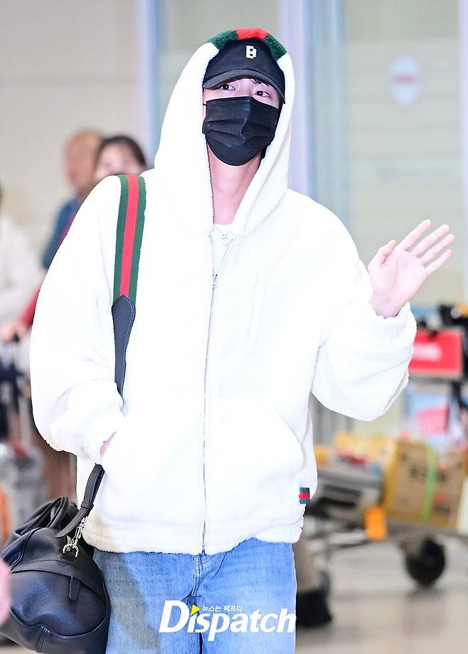 진은 화이트 컬러의 후드집업과 데님진으로 캐주얼한 공항패션을 연출했다. 마스크에도 훈훈한 비주얼이 돋보였다.