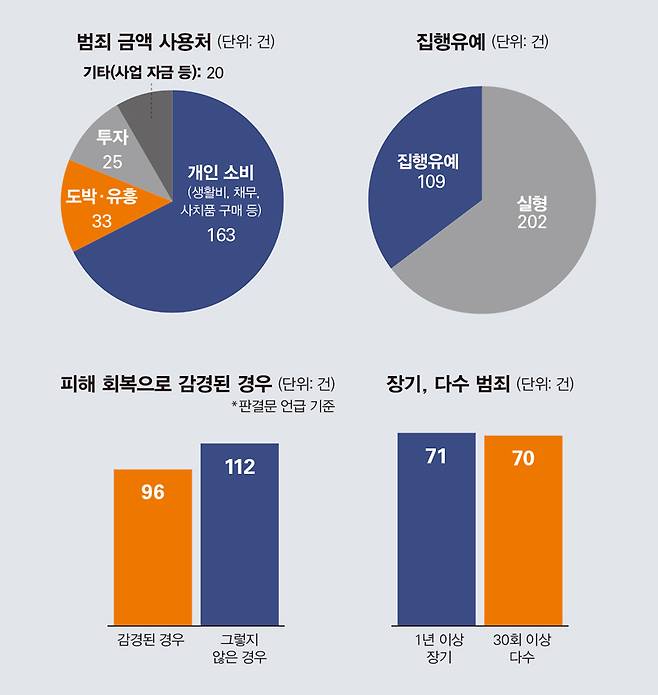 피고인이 돈을 다 써버린 탓에 피해 회복이 어려운 경우도 많았다. 판결문에서 피해액의 변제가 충분치 않다고 언급된 피고인은 112명이다. 반면 피해 회복 노력이 충분해 유리한 양형 요소로 참작돼 감경된 피고인은 96명이었다.