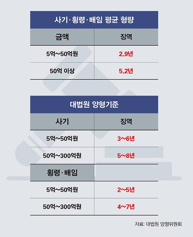 감옥에 가도 기간은 짧은 편이었다. 대법원 양형기준에 비추어 봤을 때도 형량이 최소치에 가깝기 때문이다. 범죄 금액별로 나눠보면 사기, 횡령, 배임액이 5억원 이상 50억원 미만일 때 평균 형량은 2.9년으로 집계됐다. 대법원 양형위원회는 피해액을 유형별로 구분해 양형기준을 두고 있는데, 사기범의 경우 이 구간에서 3~6년의 징역이 기본형이다. 횡령·배임은 징역 2~5년을 기본형으로 두고 있다. 이를 고려하면 평균 형량인 2.9년은 기본형의 하한에 가까운 수준이다.