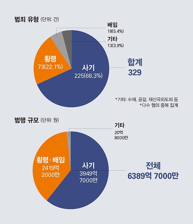 조사 결과, 특경법 위반이 적용된 혐의는 대부분 사기였다. 적용된 혐의 329건 가운데 225건으로, 전체의 68.3%를 차지했다. 횡령이 73건으로 뒤를 이었고 배임이 18건, 수재·공갈·사금융 알선 등 기타 혐의는 13건이었다. 이에 따른 총 범행 규모는 6389억7000만원에 달했다. 사기 규모가 3849억7000만원으로 절반 이상이었고, 횡령·배임 규모도 2419억2000만원으로 사기 사건을 빼면 대부분을 차지했다.