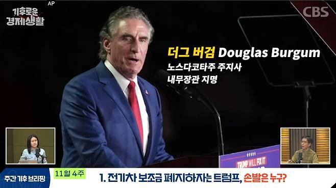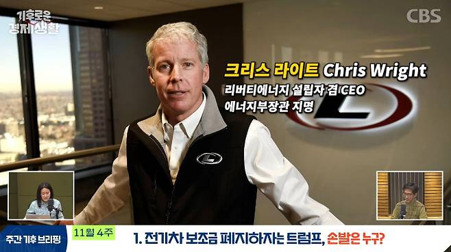 ◇ 최서윤> 에너지부 장관에 지명된 크리스 라이트, 셰일가스 업계에서 유명한 사람입니다. 셰일가스가 경제력을 가지게 된 프래킹 기술 있잖아요. 프래킹 기업인 리버티 에너지의 CEO입니다. 기후위기 부정하는 화석연료 전도사라는 별명을 갖고 있어요. 자기 개인 SNS나 폭스뉴스 평소 인터뷰를 통해서 석유화학 가스가 사람들을 빈곤에서 구원할 것이다. 이런 말을 많이 해온 사람이에요.