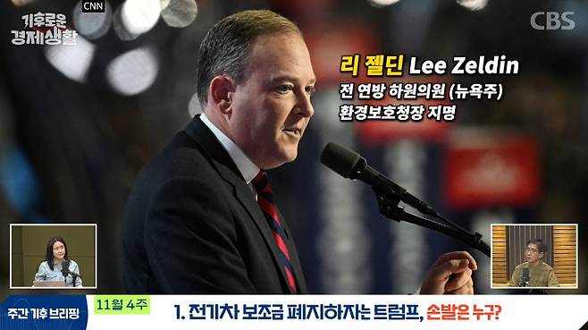 ◇ 최서윤> 그렇겠죠. 그리고 이 사람이 뉴욕주 주지사 선거 출마했었다고 했잖아요. 그때도 전기차 의무화 폐지를 공약으로 내걸었었어요. 그래서 업계에서는 이 사람이 EPA 청장으로 지목이 된 게 전기차 의무화 폐지를 속전속결로 하기 위해서가 아니냐. 왜냐하면 발목을 잡을 수 있는 기관이잖아요. 그 기관의 청장으로 이런 사람을 임명을 했기 때문이라는 말이 나옵니다.