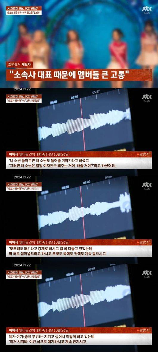 앞서 전날 방송된 JTBC ‘사건반장’은 신인 걸그룹 멤버 중 한 명이 소속사 대표에 성추행을 당했다는 제보를 보도했다. 녹취록에 따르면 한 멤버는 “대표가 강제로 뽀뽀를 하고, 가슴과 엉덩이 등 신체 부위를 만졌다”고 토로했다.