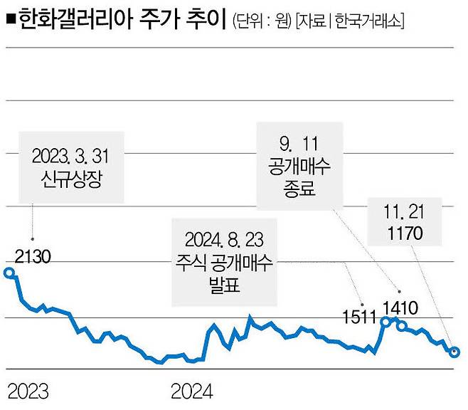 이런 분위기를 반영하듯 갤러리아의 주가도 부진한 흐름을 보이고 있다. 지난 8월엔 오너 3세인 김동선 한화갤러리아 부사장이 "책임 경영을 강화하겠다"면서 지분 공개매수에 나섰지만 주가는 반짝 상승하는 데 그쳤다. 9월 9일 1567원까지 올랐던 한화갤러리아 주가는 현재 1100원대애 머물고 있다.