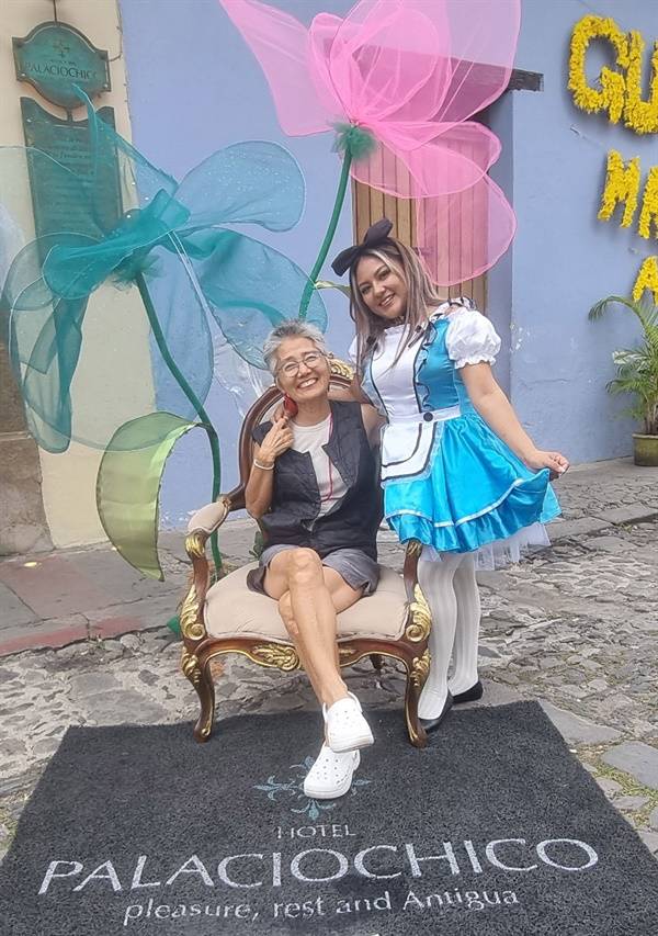 | ▲ 안티구아 꽃축제 올해의 주제인 '이상한 나라의 앨리스'에서 앨리스로 분장한 직원이 관람객들에게 즐거움을 제공하는 대신 회사의 상호를 노출하는 방식으로 축제에 참가하고 있다. 2014년의 꽃축제 주제는 루이스 캐럴의 아동 소설인 '이상한 나라의 앨리스(Alice's Adventures in Wonderland)로 이 소설을 영감의 소재로 활용해 자유롭게 표현하면 된다. |