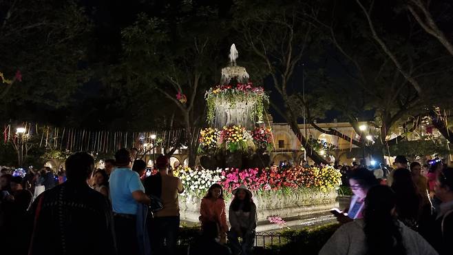 | ▲ 안티구아 꽃축제 꽃으로 장식된 중앙공원의 분수대 |