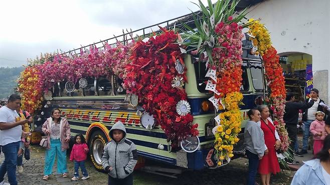 | ▲ 과테말라 치킨버스 과테말라에서 인기 있는 대중교통 수단인 치킨버스가 밤샘 꽃 장식으로 사람들이 사진 스폿이 되었다. |