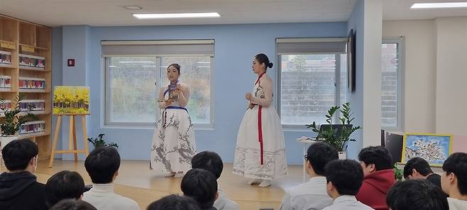 지난 21일 서산 서령고등학교 도서관에서 점심시간을 이용하여 열린 '서산 소리청 자매 초청 공연'이 학생들의 큰 호응 속에 막을 내렸다.
