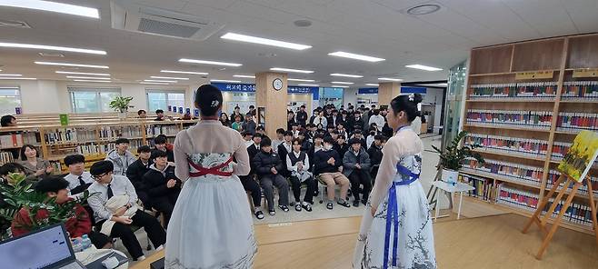 | ▲ 소리청자매의 공연 서령고 학생들이 도서관을 가득 메웠다. |