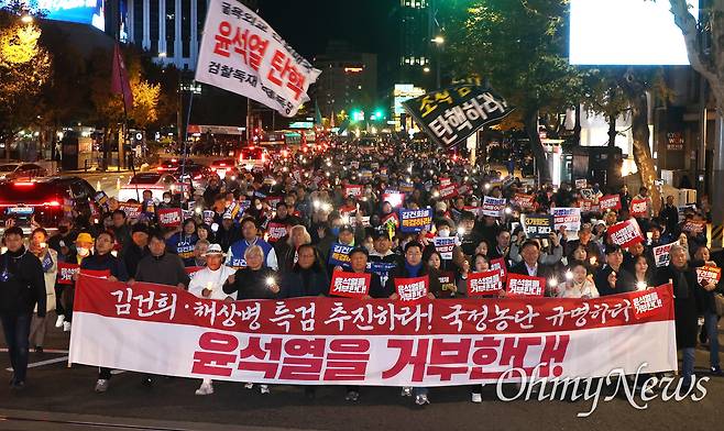 | ▲ 23일 오후 서울 광화문앞에서 거부권을 거부하는 전국비상행동 주최 ‘김건희 특검, 채상병 특검 추진, 국정농단 규명!' 윤석열을 거부한다 2차 시민행진’에 참여한 야당과 시민들이 촛불을 들고 명동역까지 행진하고 있다. |
