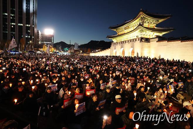 | ▲ 23일 오후 서울 광화문앞에서 거부권을 거부하는 전국비상행동 주최 ‘김건희 특검, 채상병 특검 추진, 국정농단 규명!' 윤석열을 거부한다 2차 시민행진’에 참여한 이재명 민주당 대표 등 야당 인사들과 시민들이 촛불을 들고 구호를 외치고 있다. |