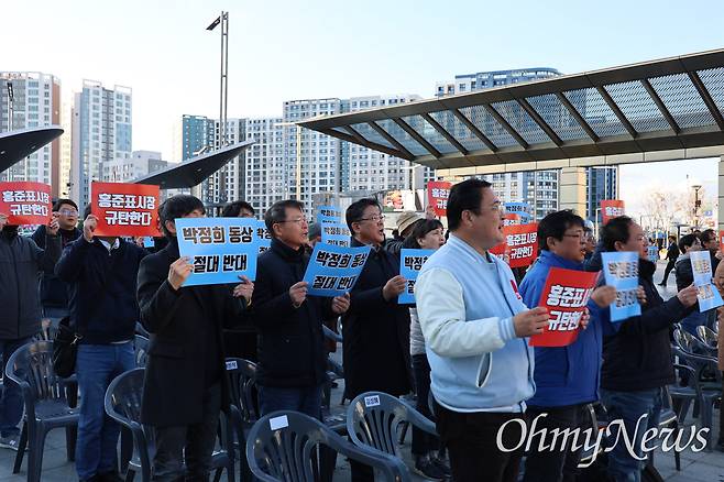 먼저 무대에 오른 남은주 박정희 우상화반대 범시민운동본부 공동대표는 "이태원 참사 100일 될 때 윤석열 대통령은 술 마시러 갔고 군위에서 홍수로 시민이 사망할 때 홍준표 시장은 골프를 쳤다"며 윤 대통령과 홍 시장을 싸잡아 비난했다.