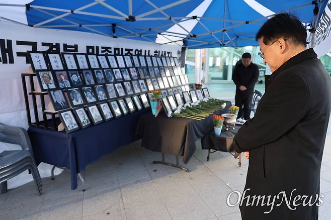 | ▲ 23일 오후 동대구역 광장에서 열린 박정희 동상 반대 시민대회에 참석한 차규근 조국혁신당 의원이 대구·경북 민족민주열사·희생자 추모 분향소에서 묵념을 하고 있다. |