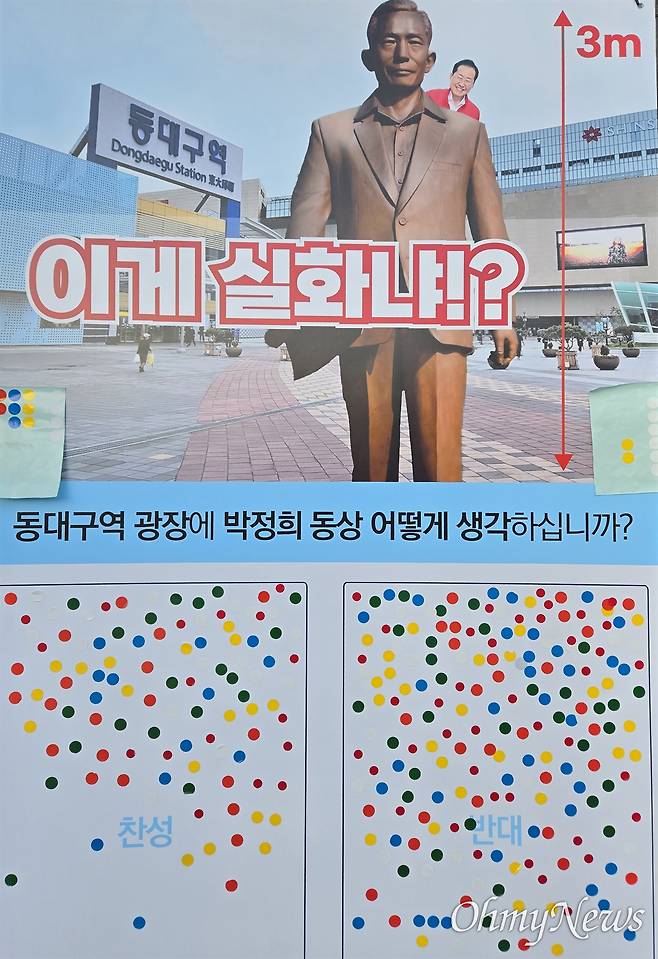 또 '이건 실화냐'라는 제목으로 동대구역에 박정희 동상을 세우는 것에 대한 찬반 의견을 묻는 스티커도 비치해 동대구역을 찾는 시민들이 의사를 밝힐 수 있도록 했다.