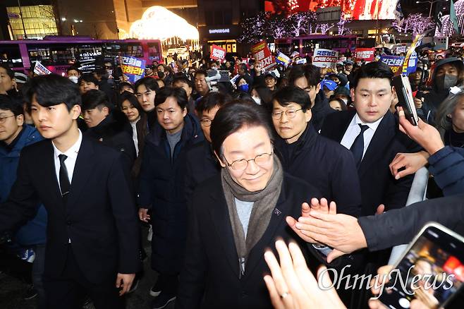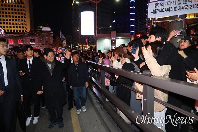 | ▲ 이재명 더불어민주당 대표가 23일 오후 거부권을 거부하는 전국비상행동이 주최한 ‘김건희 특검, 채상병 특검 추진, 국정농단 규명!' 윤석열을 거부한다 2차 시민행진’에 참석해 시민들과 함께 광화문앞에서 명동역까지 행진하고 있다. 이재명 대표가 명동 입구에서 시민들과 인사를 나누고 있다. |