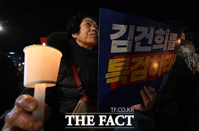 [더팩트ㅣ박헌우 기자] '김건희·윤석열 국정농단 규탄·특검 촉구 제4차 국민행동의 날' 집회가 23일 오후 서울 종로구 광화문 북측광장에서 열린 가운데 참석자들이 피켓을 들고 구호를 외치고 있다.