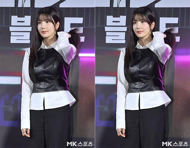 권은비는 이날 제작발표회에서 화이트 셔츠에 블랙 가죽 베스트, 그리고 블랙 팬츠를 매치해 블랙 앤 화이트 패션으로 포토월에 섰습니다.